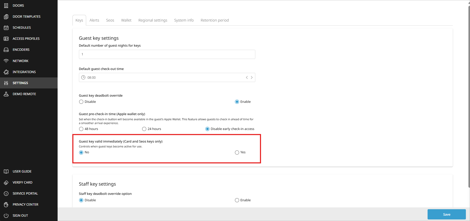 - At Expiration date for new keys (see Figure 10), if needed click the arrows to change the date (default is 180 days ahead; the default can be changed under the gear icon, choose Settings and change ‘Default number of days that staff keys are valid’).
