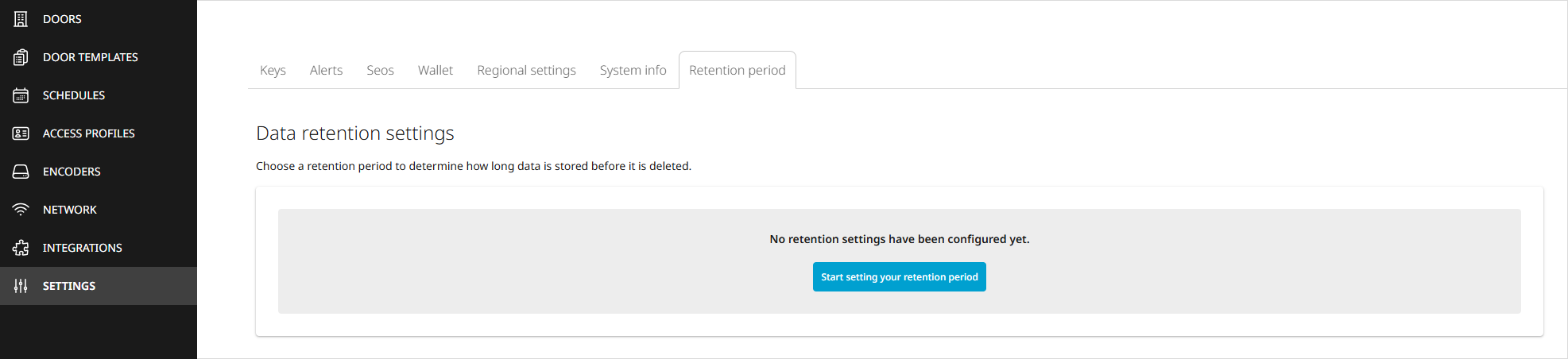 - Click Start setting your retention period; a screen as below is displayed (but with no retention period chosen). The retention setting applies to the data types mentioned on the screen.